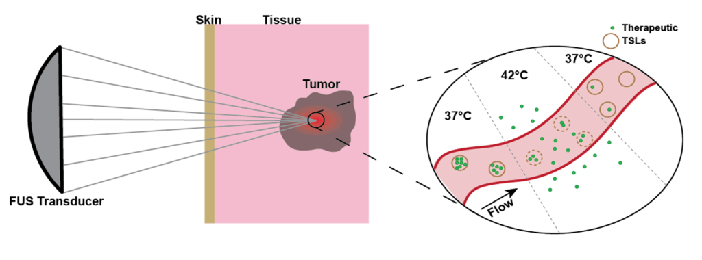 Using FUS to locally heat target tissue and trigger release from thermosensitive liposomes. Ultrasound is focused on the region of tumor growth, heating the tissue to 42°C. When liposomes in circulation reach this heated region drug release is triggered.