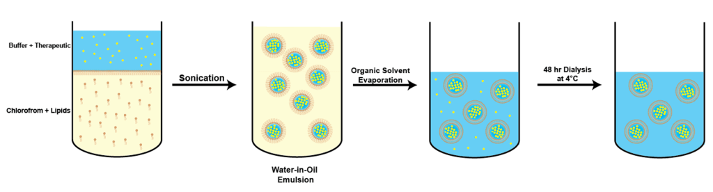 Reverse Phase Evaporation. 1. The lipids being used are dissolved in chloroform, and aqueous buffer with the therapeutic are combined, and immiscible. 2. Sonication creates a water-in-oil emulsion, with the lipids forming inverted micelles to support the emulsion. 3. The organic solvent is then removed via rotary evaporation, resulting in a final aqueous solution with liposomes. 4. The liposome products are dialyzed to remove any unencapsulated drug molecules, leaving only fully loaded liposomes